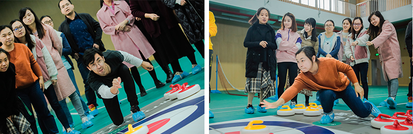按分組分開練習冰壺投擲,練習后開始比賽,以場地上陸壺球距離營壘圓心的遠近決定勝負,積分多的隊為勝。