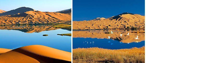 沙水相映,水天相連,沙山層巒疊嶂,婉麗綿長